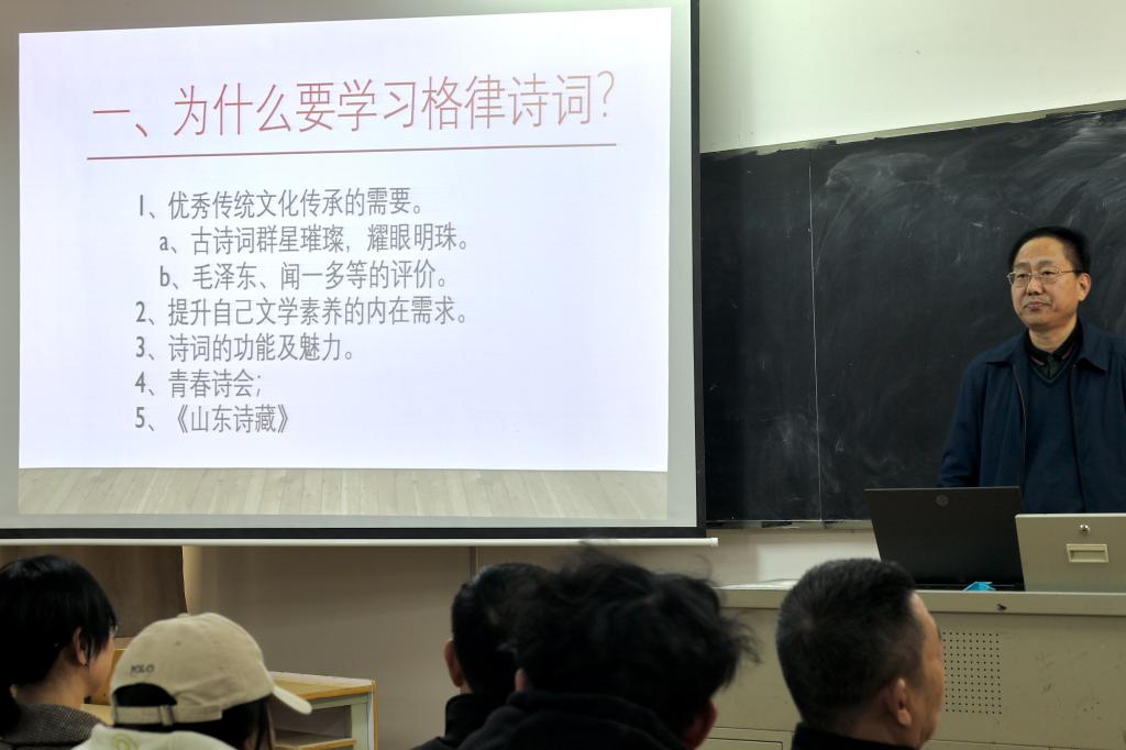为提升学生的语言表达与文字鉴赏能力,传承中华传统诗词文化,11月19日,文学院联合寿光市诗词楹联艺术家协会开展“格律诗词概说”主题活动。活动由协会专家李占强主讲,文学院“三味书屋”读书会、文化创意与设计社团成员以及校内诗词爱好者参与。