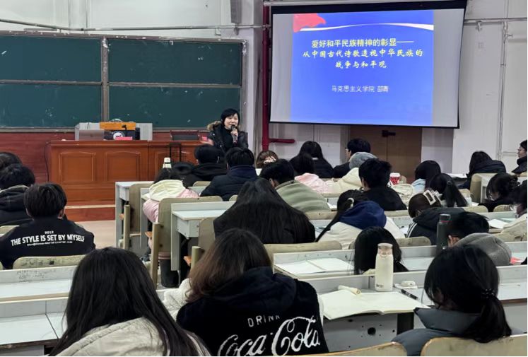 讲座中,邵青教授通过中国古代诗歌解读了中国人的战争与和平观,以爱好和平的民族精神在古代诗歌中的彰显为核心,深入剖析了诗歌的深邃内涵与时代意义。邵老师强调,尽管时代变迁,中华民族对于和平的向往和追求始终如一。同时,她也鼓励学生们要深入思考战争与和平的辩证关系,以更加开放和包容的心态面对历史与现实,为推动构建人类命运共同体贡献智慧和力量。在互动环节中,同学们积极提问,就古代诗词所表达的内涵、作品解读方法等问题向老师请教。邵青教授耐心解答,为大家提供了宝贵的指导与建议。