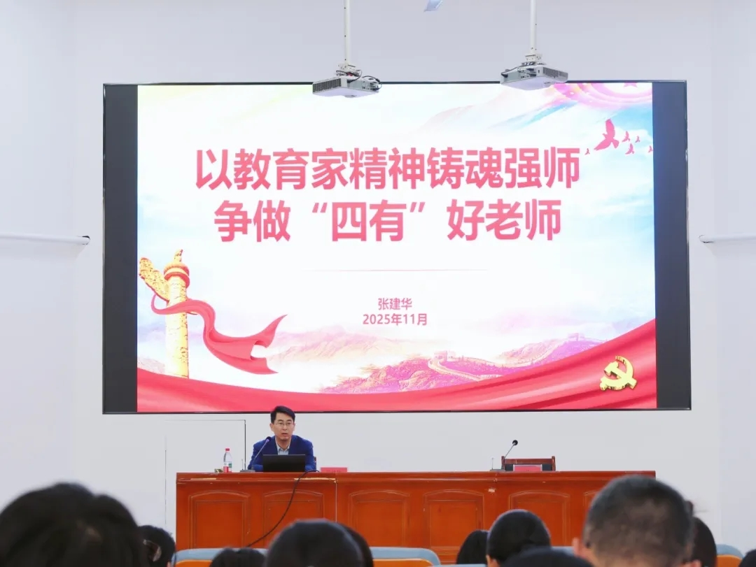 张建华部长以《以教育家精神铸魂强师,争做“四有”好老师》为题,从历史、理论、实践三重逻辑剖析“四有”好老师内涵,结合优秀教师事迹阐释其四大核心素养,并提出信仰洗礼、文化浸润等四条培育路径,同时解读学校师德师风建设规章制度。文学院院长孙淑娟在总结中强调,教师需严守校规,将学习成果转化为教育教学行动,做好学生成长示范。