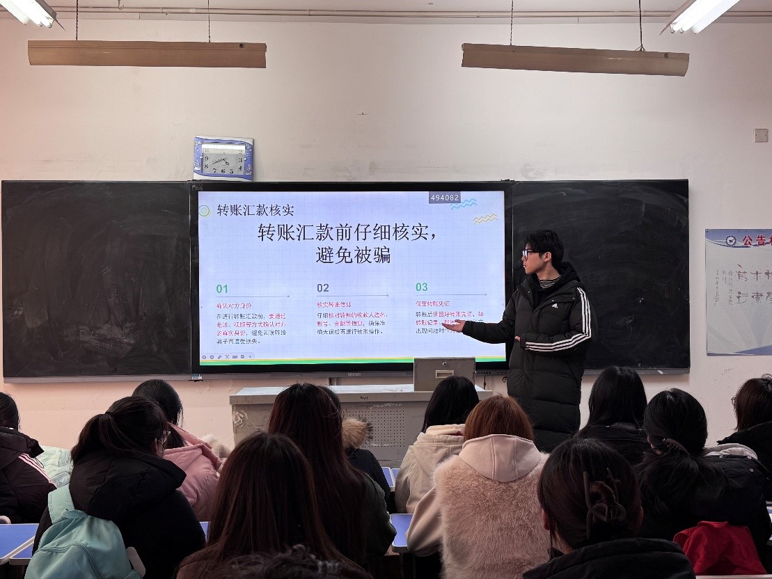 活动伊始,进行反诈培训情景模拟题的作答,引导学生沉浸式掌握基础反诈技巧,为后续培训筑牢根基。随后,王安丽同学系统拆解大学生高发诈骗的作案套路与话术陷阱,结合真实受害案例强调诈骗的隐蔽性与危害性,同时详解遭遇诈骗后的求助与维权渠道,助力学生树立“防范为先,警惕为上”的安全理念。