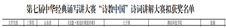 近日,由教育部、国家语委主办的第七届中华经典诵写讲大赛“诗教中国”诗词讲解大赛在北京师范大学珠海校区落下帷幕,我校文学院学生在此次比赛中荣获佳绩。