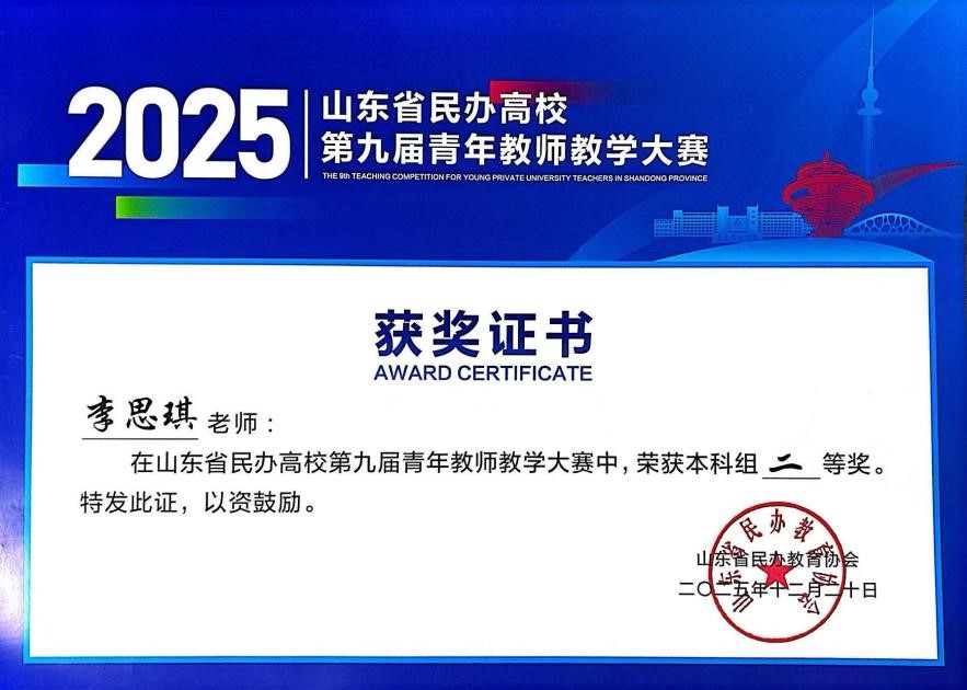 近日,山东省民办高校第九届青年教师教学大赛在青岛成功举办,文学院教师李思琪凭借扎实的专业功底、精心的教学设计以及生动的课堂呈现荣获二等奖。