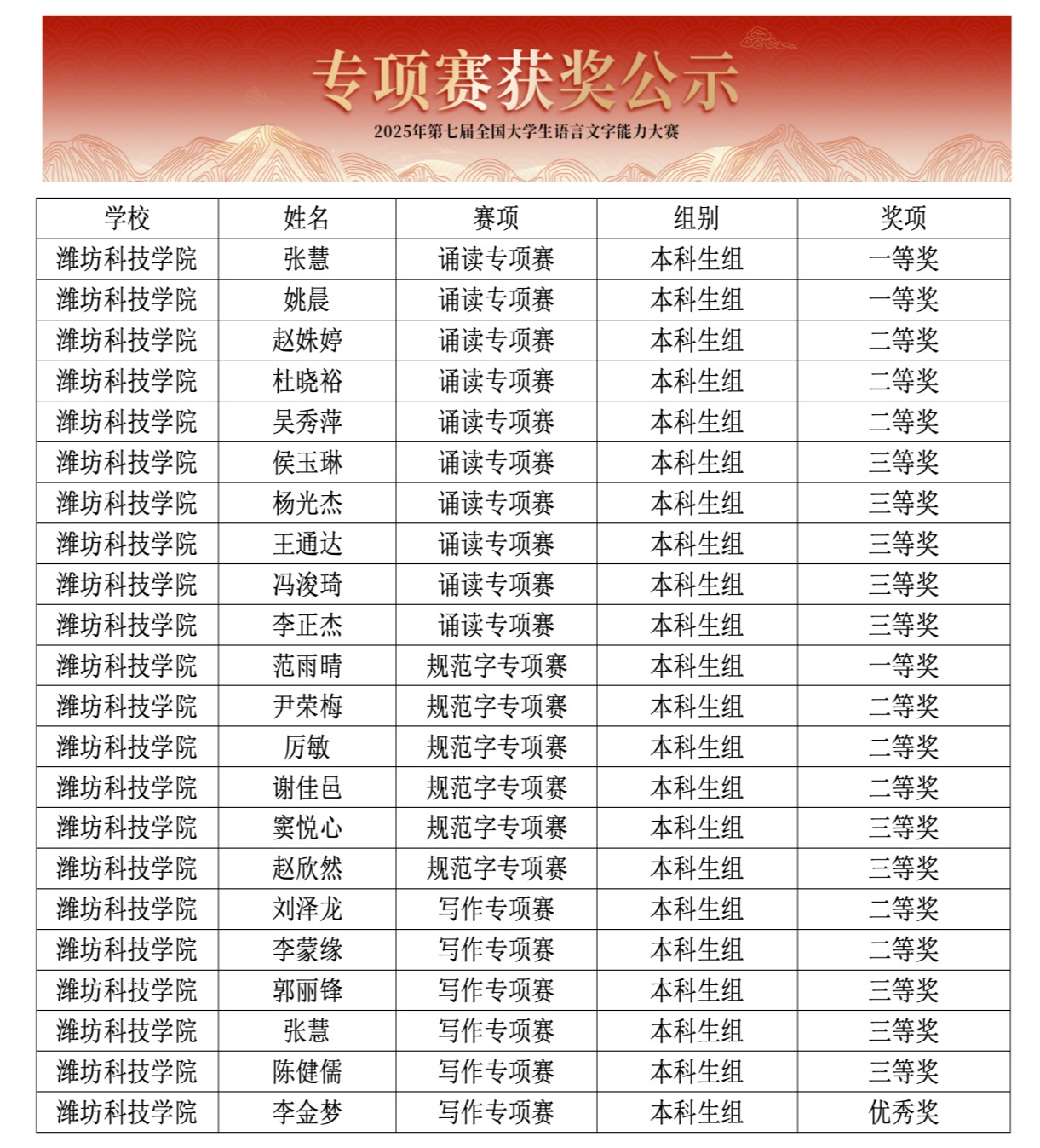 近日,由中国语文报刊协会读写教学分会主办的第七届全国大学生语言文字能力大赛专项赛评选结果揭晓。文学院学生凭借扎实的专业素养和出色的语言文字应用能力,在多项比赛中荣获佳绩。其中,诵读专项赛获一等奖2项、二等奖3项、三等奖5项;规范汉字专项赛获一等奖1项、二等奖3项、三等奖2项;写作专项赛获二等奖2项、三等奖3项、优秀奖1项。